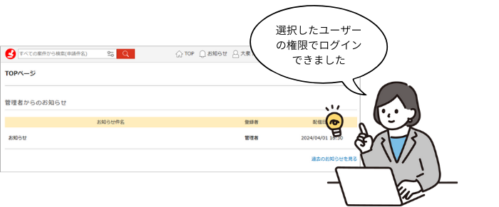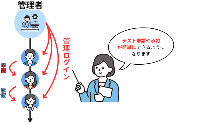 管理ログインを使って申請や承認をする際は、申請者や承認者となる一般ユーザーのIDやパスワードを把握する必要がなくなり、テスト申請や承認が簡単になります。