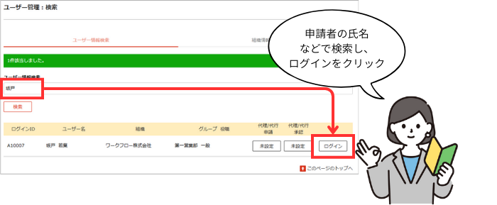 ②テスト申請したいユーザーで検索して、[ログイン]ボタンをクリックします。