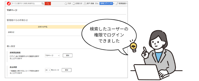 管理ログインとは、管理者権限を持つアカウントを使って、一般ユーザーの権限で申請や承認ができるようになる機能です。