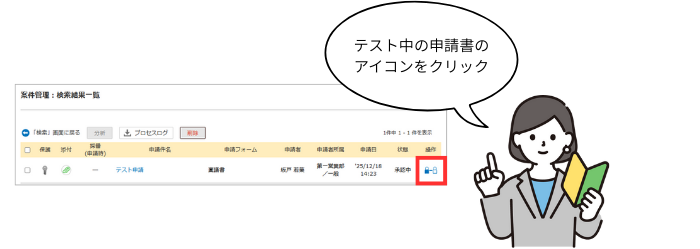 ③一覧からテスト申請中の申請書を探し、[進捗を確認]アイコンをクリックします。