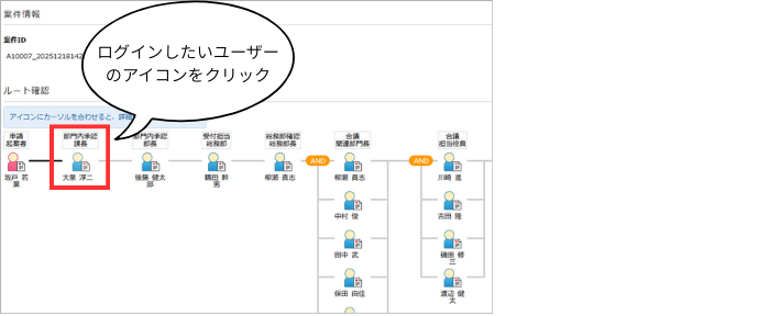 ④テスト中の申請書のルートが表示されるので、ログインしたいユーザーのアイコンをクリックします。
