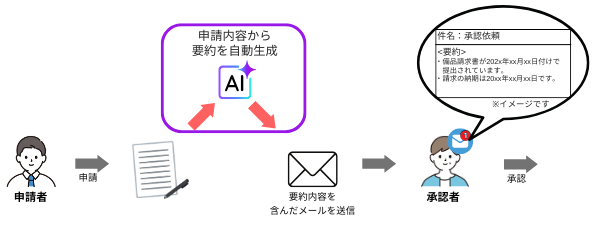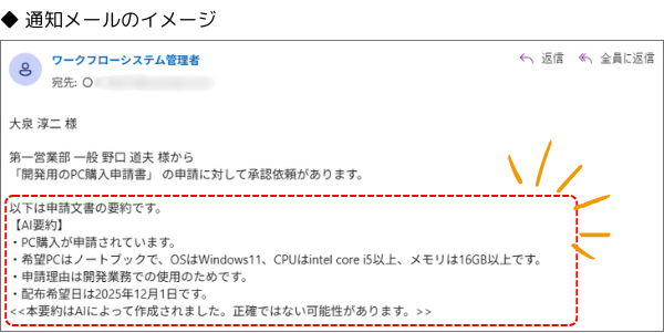 生成された要約は通知メールに表示でき、承認者はメール上の要約から申請内容の