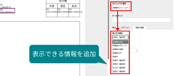 情報表示フィールドに表示する項目として、決裁日、完了日、否認日を追加しました。