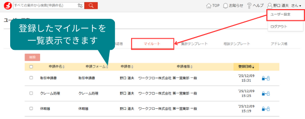 ユーザー設定画面のマイルートタブから登録したマイルートを一覧表示できます。